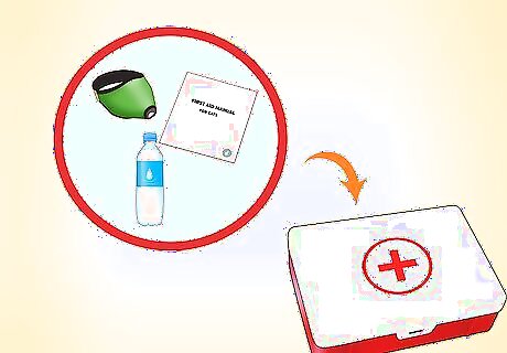 Add pet-specific items. Now, add things that your pet may need in case of an emergency or injury but that aren’t already in the kit. Think of possible scenarios and what you might require in those situations. Consider having a pet first-aid book, with instructions on how to treat injuries, poison, and other emergencies. A muzzle of some kind is useful, as an injured or distressed cat is more likely to bite. You’ll be able to handle her more safely with a towel, as well. Of course, don’t muzzle a cat that is vomiting, choking, or having trouble breathing. Keep some water for treating dehydration and food or a nutritional supplement in case your pet needs emergency nourishment. A nylon leash and self-sticking bandages are also helpful.
