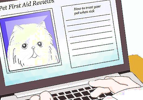Try a pet store. If you don’t want to spend the time or effort to put together first aid kit, you can always buy one ready-made. More and more pet or cat-specific first aid kits are on the market these days. Start at your local pet supply store. Many ready-made first aid kits are designed for either cats or dogs. These have basic supplies like gauze, water bottles, food, alcohol pads, and antibiotic ointment. Expect to pay $25 or more for one. There are also cat-specific first aid and emergency evacuation kits. These are more expensive, some over $150, and can have medical items and food and water supplies for several days. The Ready America “Grab n’ Go” 2-person emergency cat set is designed to keep you and your pet safe and fed for up to 3 days in an emergency. It contains food, water pouches, light sticks, a separate first aid kit, matches, pet collar, alcohol pads, and more.