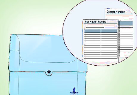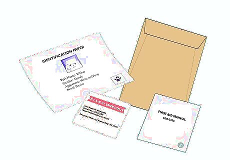 Have paperwork on hand. Like before, gather together all of your pet’s medical records as well as important phone numbers and contact information, in a water-proof container. It’s a good idea to have phone numbers and directions for the nearest pet clinic, your vet, and a poison control center or hotline. Have proof of your cat’s vaccinations for rabies and other diseases, copies of medical records, and a current photo in case she gets lost. You can include other information like the cat’s breed, age, sex, and any other health problems, as well as your own contact details.