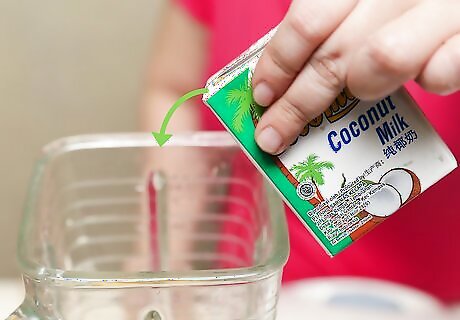 Pour in 1/3 cup (80 milliliters) of unsweetened almond milk. You can use the plain kind or the vanilla flavored kind. For a twist, you could even try coconut milk instead! For an even thicker milkshake, add in some ice cubes or frozen almond milk.