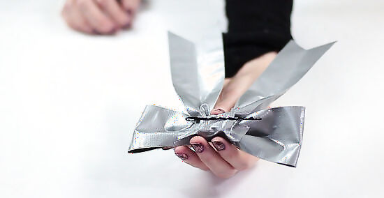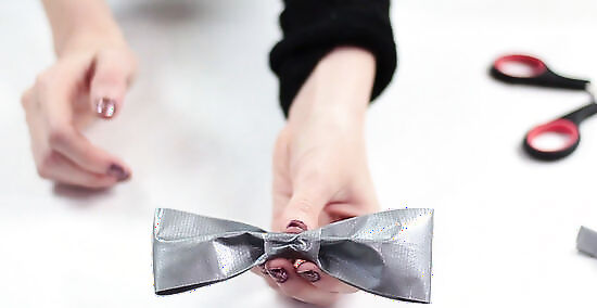 Secure the folds with a ½ by 2 inch (1.27 by 5.08 centimeters) piece of duct tape. You may have noticed that your bowtie has two folds and a groove on one side, and one fold and two grooves on the other. Flip the bowtie over so that the side with the two folds and one groove is facing you. Fold the small, ½ by 2 inch (1.27 by 5.08 centimeters) piece of tape over the two folded bits in the center. Do not press the sticky ends of the small piece of tape down just yet.