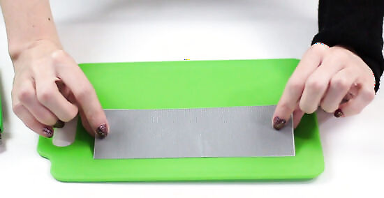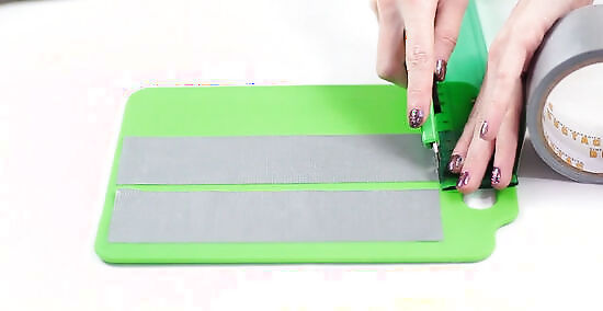 Cut four 12 inch (30.48 centimeters) pieces of duct tape and place them on a cutting mat. Try getting a cutting mat with a grid and ruler printed on it; you can these as a guideline. Keep the tape sticky-side-down on the cutting mat. Use an craft knife with a sharp blade and a steel ruler to make straight cuts. Cut four ½ by 2 inch (1.27 by 5.08 centimeters) pieces of duct tape. You will use these later. Cut two 1 by 3 inch (2.54 by 7.62 centimeters) pieces of duct tape. You will use these later.