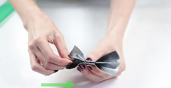 Fold the other strip into a ring, and secure it with a piece of tape. Take the other strip and fold it in half to create a crease. Do not cut it. Instead, unfold it, and bring each narrow end towards the crease. Take a ½ by 2 inch (1.27 by 5.08 centimeters) piece of duct tape, and tape the two narrow ends together so that you end up with a 2 by 6 inch (5.08 by 15.24 centimeters) duct tape ring. This will create the loops of your bow.