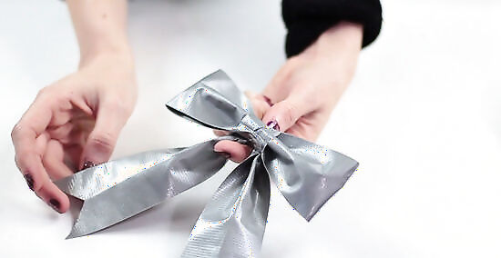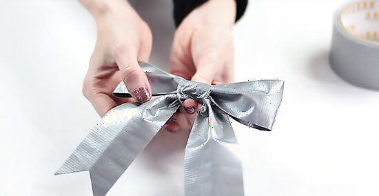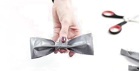 Secure the center of the bow with two 1 by 3 inch (2.54 by 7.62 centimeters) pieces of tape. Cut two 1 by 3 inch (2.54 by 7.62 centimeters) pieces of duct tape. Wrap one of the pieces around the center of the bow. When you are done, wrap the second piece around the center of the bow. Make sure that the seams are in the back of the bow.