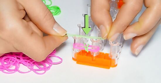 Place another band above the two bands still on your two loom pegs. You may need to slide the two bands already in place down to make more room for your new band. The new band you are adding will not need to be twisted, simply place it on the pegs above the other bands.