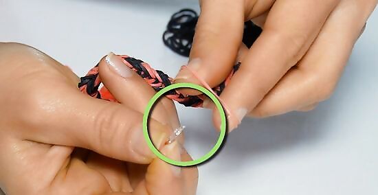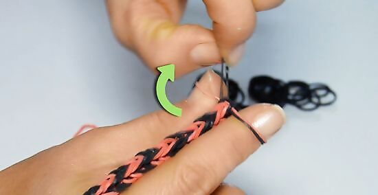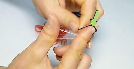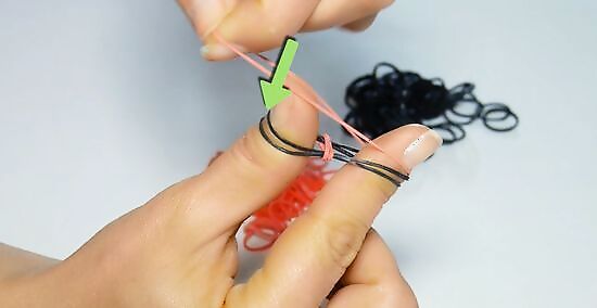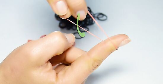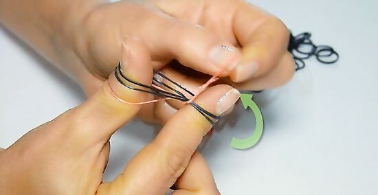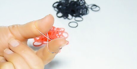 Twist the first band around your pointer and middle fingers. With your palm facing your body, place one end of the band around your pointer finger. Twist the band into a figure eight, called by some an "infinity shape," and loop the other end of the band over your middle finger.