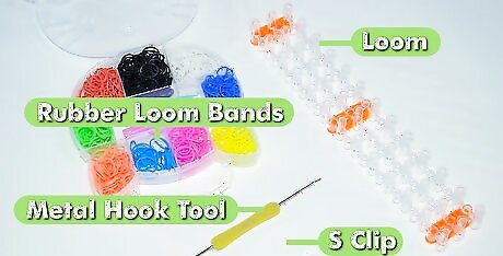 Gather your materials. Although the method is very similar to making a bracelet with a loom, making a bracelet without a loom requires less materials. 10-20 rubber bands, in any color or colors you like. Two fingers. These will act in place of a loom. A plastic "S" or "C" shaped clip. You'll need this clip to close your finished bracelet.