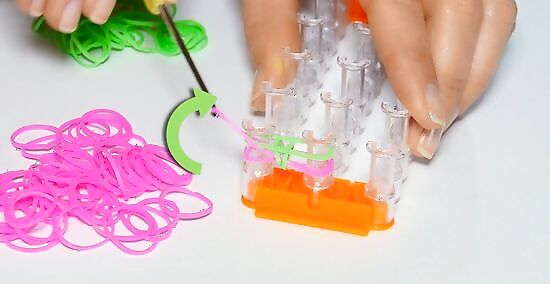 Continue repeating this pattern. As you add bands to your bracelet, a fishtail pattern will develop. Keep going until you reach your desired length. As you continue your pattern, you will see your fishtail bracelet grow out from between the two pegs. You may need to push down or pull the fishtail to tighten the bands of your bracelet.