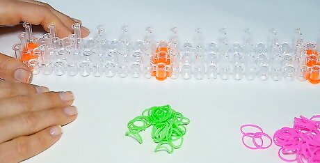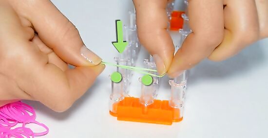 Place the first band on the loom. Do this by twisting your first band into a figure eight, sometimes called an infinity shape. Place each end of the band around one peg. Push the band down towards the base of the pegs. This will make room for the next bands you add to your loom.