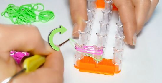 Release your figure eight shaped band from its peg. Grab either end of your bottom band and, using your hook or pick tool, pull it up and over the peg so that it loops around the middle of your second and third band. Do this to both sides of your bottom band, so it is no longer attached to either peg. The figure eight twist will still be intact, and now your bottom band will tied around the two top bands. If you like, consider using a different color band at this point. This will give your bracelet a rainbow effect.
