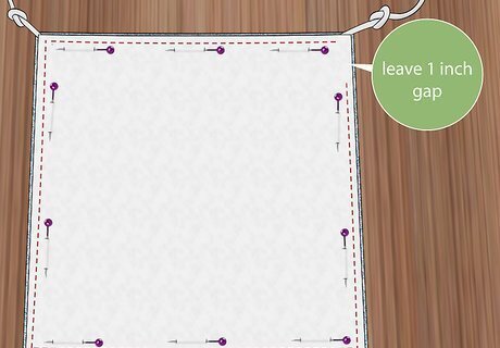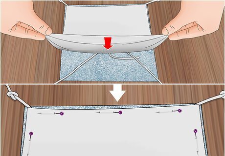 Pin the cotton cloth to the fleece. Lay the cotton cloth over the string and fleece cloth, pattern side down. Place sewing pins every 2 in (5.1 cm) around the outside edge of the cloth squares to attach the cotton fabric to the fleece. The pattern on the cotton cloth will end up on the outside of your hamster hammock when you’re done making it.