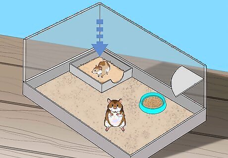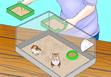Place the litter box into the existing substrate in the corner of the cage. This makes it easier for your hamster to access the litter box and encourages them to use it. Aim to have the lip of the container just above the existing substrate so that you can easily remove it. Hamsters tend to naturally go to the bathroom in the corner of their cage, so place the litter box in the corner for best results.