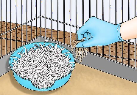 Place soiled substrate into the box to encourage your hamster to use it. Placing the litter box into a corner in the hamster cage will encourage your hamster to use it. However, if your hamster isn’t using the box, simply place a handful dirty substrate from the cage into the litter box. The smell of the substrate will encourage the hamster to use the box in the future. Wear gloves when handling soiled substrate to keep your hands clean.