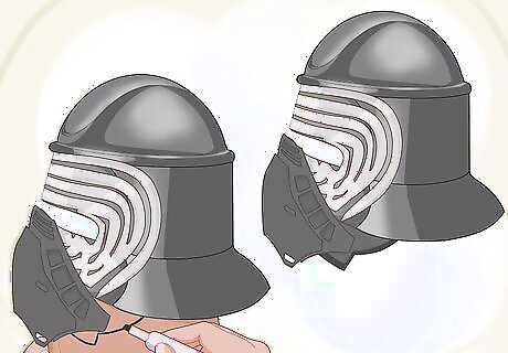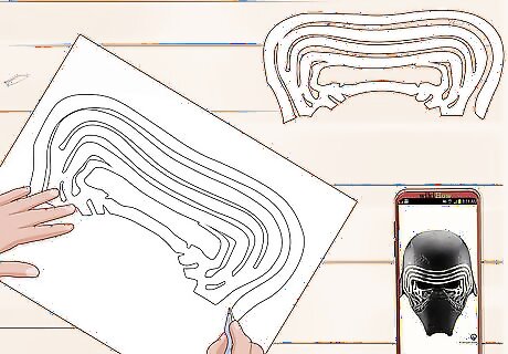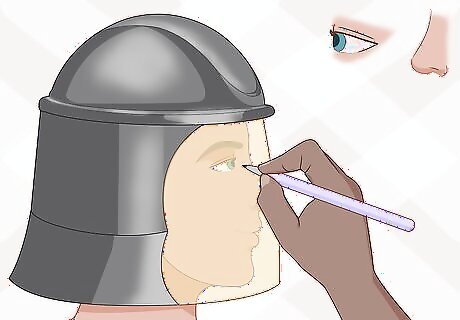 Figure out the placement for your eyes and nose. Tape the paper template to the front of your helmet, making sure that the curved edges match up with the drawn lines on the neck guard. Put the helmet on, then feel where the bridge of your nose and eye sockets are through the paper. Mark these lightly with a pen or pencil.