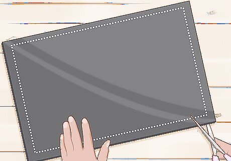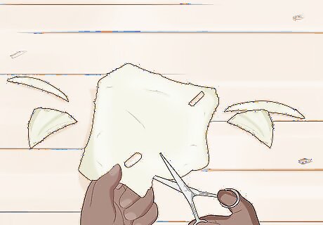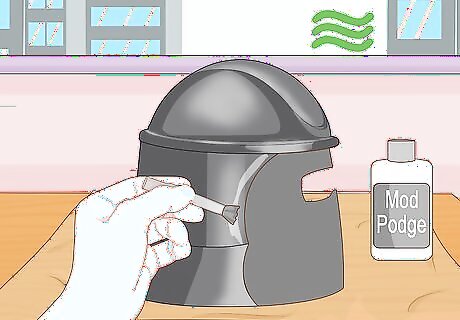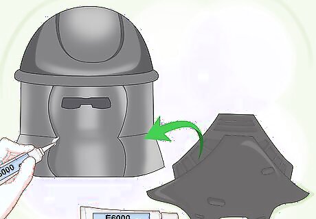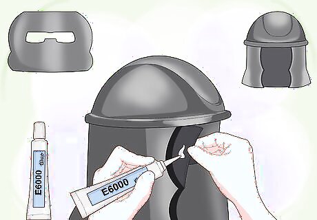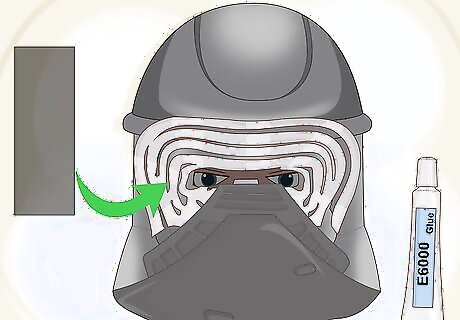 Glue a translucent, black material behind the eyes. Find sheer, black fabric, such as tulle or chiffon, and cut it into a rectangle big enough to cover the eye hole. Glue the material to the inside of the helmet, just behind the eye hole. You can also use translucent black plastic for this. Make sure that you can see through it.