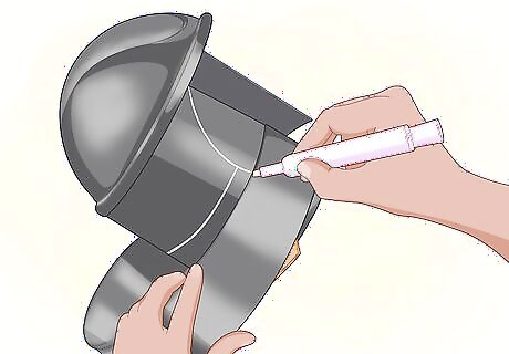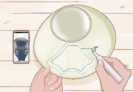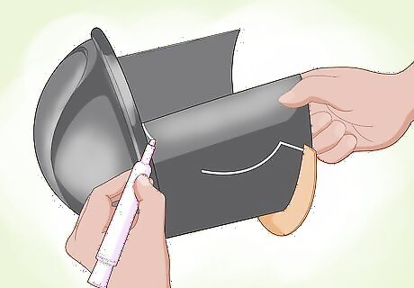 Trace the outline of Kylo's mouthpiece onto the edges of the neck guard. The shape starts at the top-right corner, where the vertical edge of the neck guard touches the dome's rim. It curves down towards the bottom edge of the neck guard, like a (, then angles sharply back like a /. Reverse the shape for the left side of the neck guard. If you are using black or dark-colored plastic, use a white chalk or marker so that you can see the lines clearly. Look at reference photos of Kylo Ren's helmet from the side. Copy the side edge of his mouthpiece as best you can.