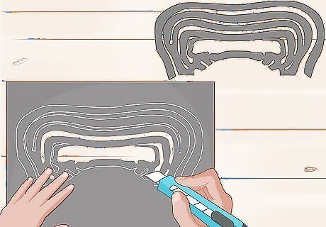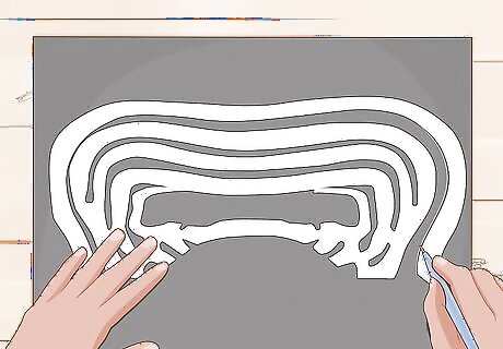 Trace the mouthpiece onto cardboard using the gray foam as a guide. Place the gray craft foam piece you just finished cutting onto a piece of cardboard. Make a mark in the middle of the eye opening, then sketch the bottom of the mouthpiece below the craft foam. Use reference pieces of Kylo Ren's mask as a guide. Set the gray piece aside, then finish your drawing. If you don't have anymore cardboard, use another sheet of craft foam instead. Kylo Ren's mouthpiece as has an upward arch cut into the bottom. Be sure to include this!