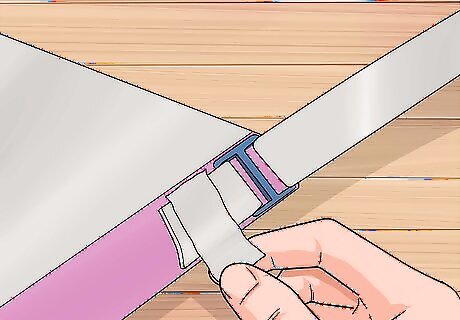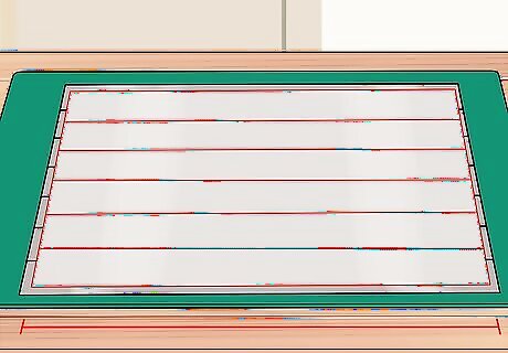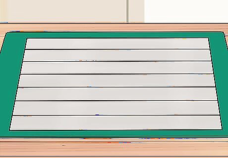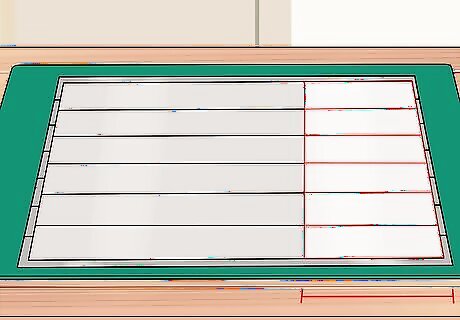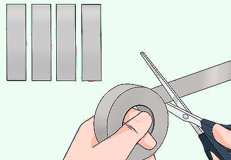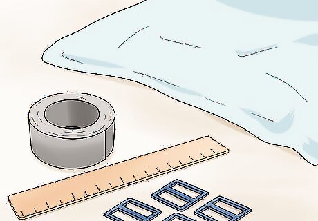 Prepare to make a bag. You’ll need a pattern and supplies in order to make this bag. Thankfully, the supplies are minimal and the pattern is very simple. Having everything you need before you start will make the process more smooth and efficient. Make a pattern, if you want to. The main portion of the bag will be formed from one single piece of tape-fabric (pieces of duct tape, layered to create a single surface). The shape will overall resemble one large rectangle with two smaller rectangles attached at its side. You will, of course, need duct tape to make the bag from. You can find duct tape in a variety of locations and it is available in a wide range of colors and patterns. You will need fixtures for the bag. Four fixtures (two large, two small) will be needed to attach straps to the bag and you will need one buckle to close it with, as well as reinforcing rings for the buckle holes. All of these can be purchased from craft stores or salvaged from second-hand purses or messenger bags. Importantly, you will need a surface on which to build your bag and straight pins to keep the tape in place while you work. A large sheet of cardboard will be the cheapest and simplest solution. Finally, you will need a standard ruler (wood or metal), a measuring tape and cutting tools. The ruler will be sacrificed to reinforce the handle of the bag, so be sure it is one you will not need to use later.