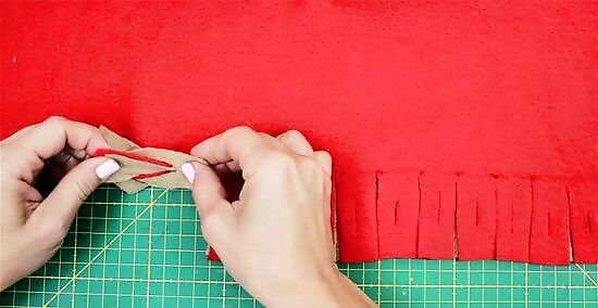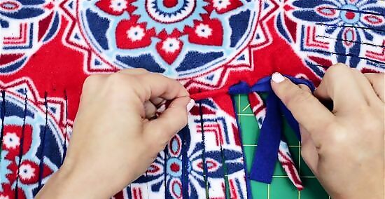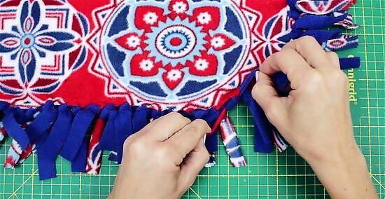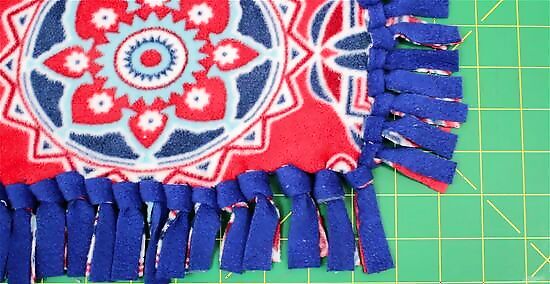 - Tie the fringes of the fleece lengths together using overhand knots, double overhand knots, loops, or braided edges.
