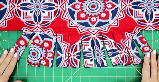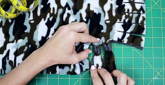 - Cut a 4 in (10 cm) square out of each corner, then cut 4 in (10 cm) strips all along each edge of both lengths of fleece.