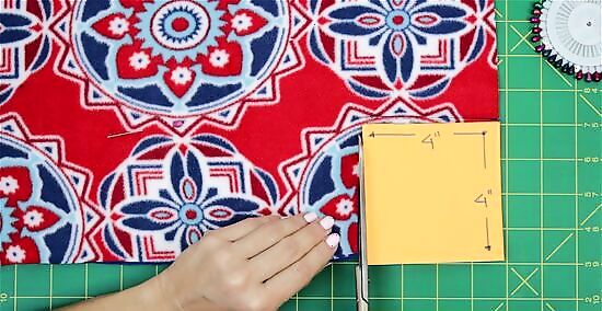 Cut a 4 in (10 cm) square out of each corner of the fleece. With a ruler or measuring tape, measure 4 in (10 cm) from the corner of one edge. From that point, use scissors or a rotary cutter to cut 4 in (10 cm) into the blanket, perpendicular to the edge. Make a similar cut on the other side of the fleece’s corner, so that the cuts meet, and you’re left with a 4 in (10 cm) square of fabric. Repeat this step for the other 3 corners. If you’re having trouble, cut along the long edge of a notecard to help you measure your cuts. Note that these empty squares won’t show up in the completed blanket—we cut them away so that we have 4 even edges to tie.
