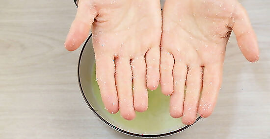 Massage the scrub into your hands, elbows, and feet before rinsing it away. Place a small handful of the salt scrub into your palm. Then rub it into your hands, elbows, or feet using small, circular motions. Use only light, gentle pressure as the kosher salt can feel quite rough. After massaging the scrub into your skin, rinse it off with warm water and pat your skin dry.