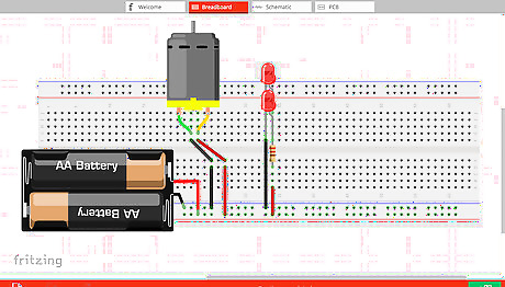 Solder the LED and resistor to the battery pack. Take some insulated wire with the ends stripped. Solder these components as follows: Solder the negative (black) wire of the battery pack to the short terminal of the LED lights. Take a 100 ohm resistor (or a resistor close to that range). Without the resistor, the light will die out. Solder one pin of the resistor to the positive wire of the battery. Solder the other pin of the resistor to the LED's positive terminal. Connect the two positive pins of the two LED's. Connect the two negative pins of the two LED's.SolderLED.jpeg