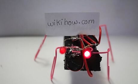 Finish your robot. Prop up your robot with the paper clip legs. Put the batteries in and watch your little robot light up and move. Keep it on a flat, smooth surface so it doesn't fall over.