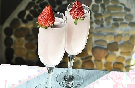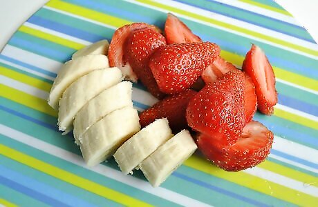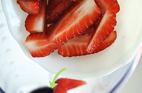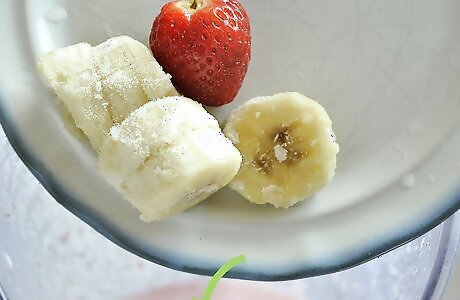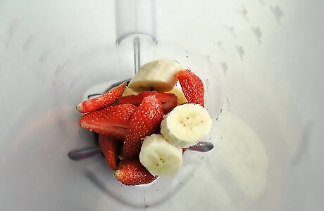 Slice up the strawberries and banana. Rinse the strawberries, chop off the stems, and cut them in half. Next, peel the banana, then cut it into slices. You can use fresh or frozen fruit; frozen fruit will give you a thicker milkshake.