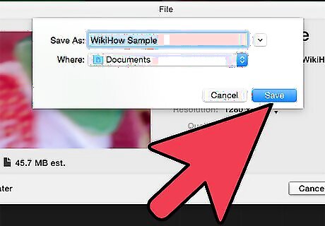 Create save title, select project size, and designate a location for project to be saved after being exported.