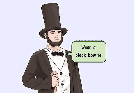 Wear a black bowtie. Lincoln was known to wear bowties. They are not commonly worn in fashion today but you can usually find them for sale at department stores and costume shops. Bowties don't need to be done up perfectly. Rather, an imperfect bowtie will give your costume that much more character. Lincolns bowties were obviously hand-tied, but pre-tied bowties are available as well if you don't want to bother with the tying process. To hand-tie a bowtie, loop the bowtie around your neck, leaving a few inches more on one side. Draw the longer end under the other side of your tie and loop it through the center, tightening it as you go along. Bring the longer end of the bowtie over the other end and pinch them in the middle, looping the longer end through a hole at the back. Tighten it gently.