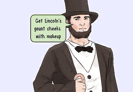 Get Lincoln's gaunt cheeks with makeup. Lincoln had a very striking face, with sunken cheeks and protruding cheekbones. One way to replicate this look is by using stage makeup. You should first suck n your cheeks. This way, you'll be able to see where the contours of your face are. Next, take a grey or brown stage makeup and apply it to the area that's sucked in. Blend the edges with your fingers. Because "gaunt cheek" makeup is usually reserved for horror costumes, it's a good idea to be very moderate with the makeup you use here, provided you're going for a "realistic" Lincoln. You can try different variations on makeup to create different looks. A "zombie" Abe Lincoln can be done by using lots of white with black around the eyes.