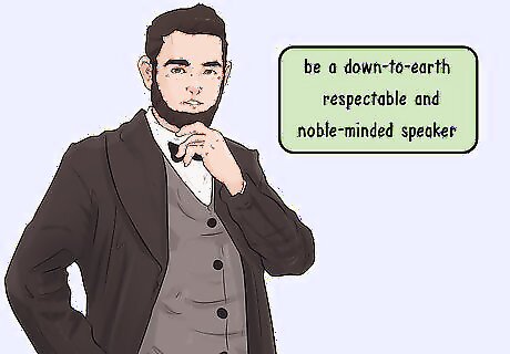 Speak with civility and politeness. Lincoln was no pushover, but all of his recorded speeches make him out to be a very down-to-earth, respectable and noble-minded speaker. If you want to be a great Abraham Lincoln, you should act with nobility no matter where you are. Keep your volume levelled, and don't speak out of turn. However, when you do speak, you should do so with force and conviction. This manner of speaking is a good part