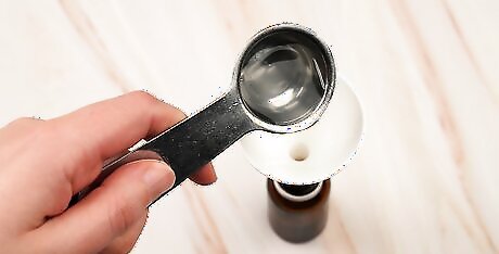 Pour 2 US tbsp (30 mL) of a carrier oil into a bottle. Whatever carrier oil you choose forms the main ingredient in your beard oil. It is used to dilute any essential oils you add later. There are a variety of carrier oils you can use, so experiment until you find at least 1 you like. Each oil has its own faint scent and may react differently on your hair and skin. Jojoba oil is the most common carrier oil option. It is said to be similar to natural skin oils and have anti-inflammatory properties. Coconut oil is another popular choice often used to nourish skin. It is said to have anti-inflammatory properties as well. Argan oil is a carrier oil used to repair damaged hair and patchy beards. It is rich in several nutrients, such as vitamins A and E. Sweet almond oil is an antioxidant rich in vitamin E. It is often used to nourish skin and promote cell regeneration.