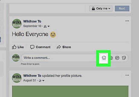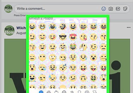 Click the smiley face icon. It's in the far-right side of the comment box if you're leaving a comment. Doing so prompts a drop-down menu. If you're creating a status, you'll see the smiley face in the lower-right side of the status box. On posts with large numbers of comments, you'll first have to click Comment below the post.