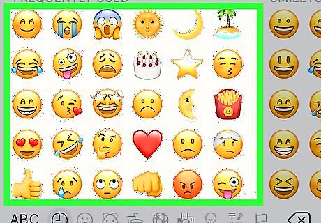 Open your phone's emoji keyboard. To do so: iPhone - Tap the smiley-face icon in the bottom-left corner of the keyboard. If you have more than two keyboards, you'll tap the globe-shaped icon and select the Emoji option instead. Android - Tap the smiley-face icon next to the spacebar, or tap and hold the keyboard and then select the emoji keyboard. On some Android phones, you can tap and hold the microphone icon and then select the emoji keyboard in the pop-up menu.