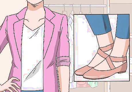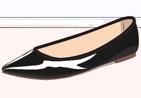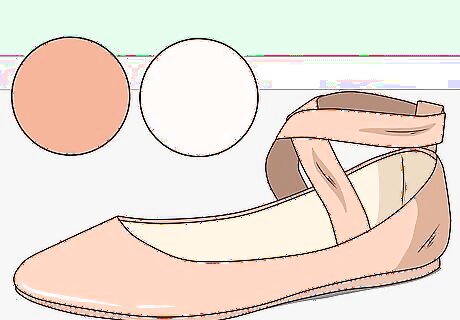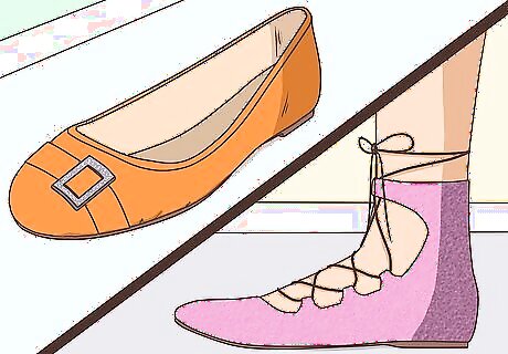 Wear nude flats. Minimal nude flats are very trendy right now and tend to match almost everything. Shop for a strappy pair of nude ballet flats, which are extremely popular. However, try to keep your nude flats immaculately clean. One downside of nude shoes is that even the smallest of scuffs and stains are very conspicuous. Nudes also tend to create the illusion that you aren’t wearing any shoes. If your flats are beat up and dirty, it can unfortunately look like you have grubby feet.
