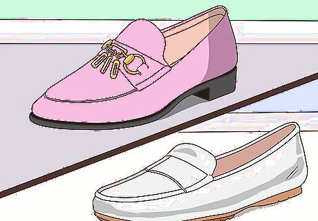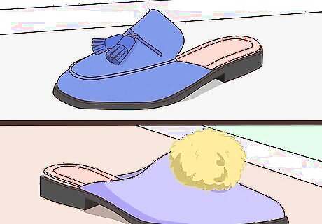 Give mules a try. Mules are slide-on flats that have recently made a huge comeback in fashion. They cover your toes and most of your feet, but leave the heels exposed. Look for an eye-catching pair with unique details like studs, tassels, and pom poms. Shop for luxe materials like patent leather or suede, which look classically stylish. Add a pop of color to a neutral outfit by wearing a pair of mules in a fun color, such as cherry red.