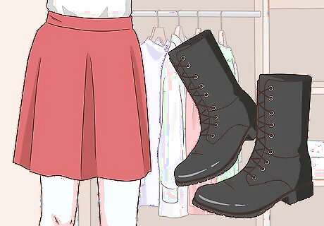 Wear flat boots with a short skirt or shorts. Offset a girly above-the-knee skirt with a pair of flat military boots for a trendy look. Create a boho vibe by pairing shorts and a loose, semi-tucked shirt with a pair of chunky, flat ankle boots. Putting together knee-high flat boots and a casual dress can also look great, just make sure the boots fit to your legs closely. Studded ankle booties with a biker vibe are very popular right now. Wear them with a skirt to give your look an edge.
