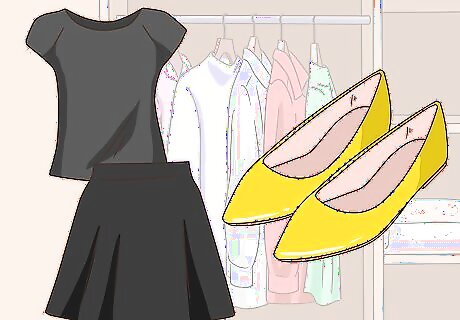 Contrast the colors of your flats and outfit. A pair of brightly colored flats can brighten up a neutral-colored outfit with a pop of unexpected color. For example, add some pizzazz to your classic white button-up shirt and distressed cropped jeans with a pair of bright red mules. Liven up a black skirt and black blouse with a pair of vibrant yellow pointed-toe flats. When choosing a contrasting-colored shoe, opt for colors that have the same amount of saturation as the colors in your outfit.