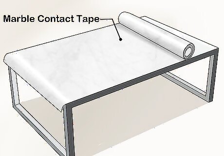 Spread marble contact tape over the top of glass or metal coffee tables. To make coffee tables look older and sturdier, add a layer of marble contact tape over the top. Cut out a sheet of contact paper that's the same size as your coffee table top and remove the adhesive backing. Place the contact tape carefully over the tabletop and smooth it out to get rid of any lines or bubbles. Marble contact paper can be purchased online or at many home improvement stores.