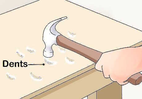 Dent the furniture yourself with a hammer. For an older and weathered look, take a hammer and make dents or dings into the surface. To add scratches, drag a sharp object like a screw across the surface of the wood. Try not to overdo self-aging the furniture. A few tasteful dings and scratches will look much better than overly-damaged furniture. If your furniture has a varnish or stain, sand it down first.