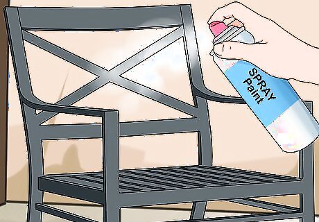 Spray paint your metal furniture. Hold the paint can several inches away from the object's surface and spray it in sweeping layers. Make the first coat any color of your choice and the second a faux-rusty brown. Once you've reached the desired aged look, let your spray paint dry. To make the furniture look even more weathered, sand the furniture's edges down after spray painting it. You can purchase spray paint at most craft or home improvement stores. Gold spray paint in particular can add an older, regal feel to furniture. You can spray paint the entire piece gold or use it to embellish specific parts of the furniture (like the knobs, siding, or crown molding). To spray specific sections of the furniture gold, cover any areas you don't want to paint with kraft paper and masking tape.