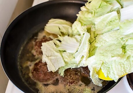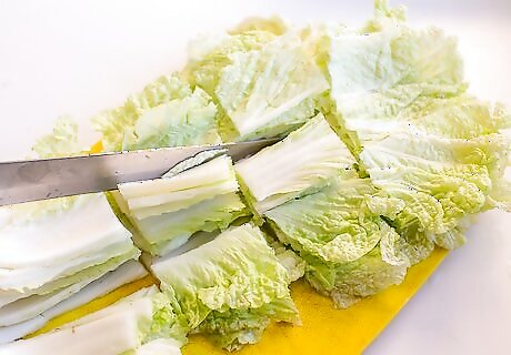 Prepare the cabbage. Quarter the leaves of the cabbage lengthwise. Then cut each leaf horizontally into thirds. Set the cabbage aside.
