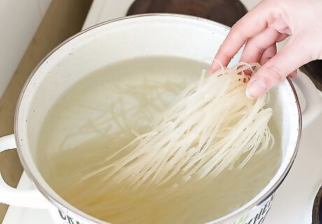 Bring the water to a boil. Pour two quarts of water into a large pot. Place the bean-thread or cellophane noodles in the water. Bring the pot of noodles and water to a boil over medium-high heat.