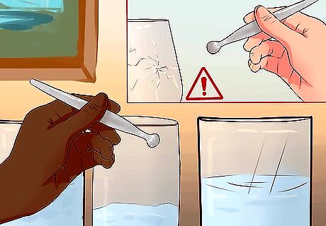 Tap the glasses with a solid instrument. Dinner utensils are common instruments used to play the glasses. However, pencils, pens, rulers, or even drum sticks can be used to similar effect. Take care not to hit the glasses too hard. You can end up cracking the glasses, or even breaking it entirely.