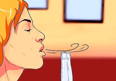 Blow across the top of the bottle rim. Produce a thin, concentrated breath. You want the air to travel horizontally across the top of the rim, rather than directly inside of the bottle. You should hear a hollow sounding, dull whistle. On a windy day, set your beer bottle on a table. The wind will glide across the bottle, producing the type of sound you are looking to emulate. As you drink from the bottle (or fill it up), use a marker to note how much liquid is needed for particular notes. You can then use this bottle to gauge how to fill up other bottles to create harmonious notes.