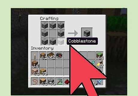 Craft a furnace. To craft a furnace, you will need 8 pieces of cobblestone. Cobblestone can be obtained by mining stone with a wooden pickaxe or better. Open a crafting table and place a piece of cobblestone in every slot except the middle. You could also use a smoker, this will cook the meat faster than a furnace.