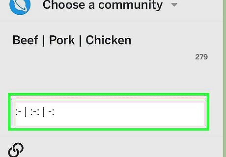 Type the title of each column followed by a vertical bar, "|", in between. For example, if you wanted 3 columns in your table titled "beef," "pork," and "chicken," you would type: Beef | Pork | Chicken. On an iPhone keyboard, tap the 123 key, then the #+= key, and the | key is the third from the left in the middle row.
