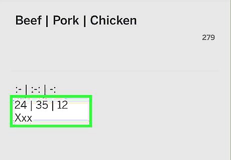 Enter the data for each cell separated by a vertical line, "|", for each column. Using the previous example, if you wanted the 'Beef' column to be "25", the 'Pork' column to be "35", and the 'Chicken' column to be "12", you would write: 24|35|12. Tap ⏎ Return and repeat this for any additional rows you want to add to the table.